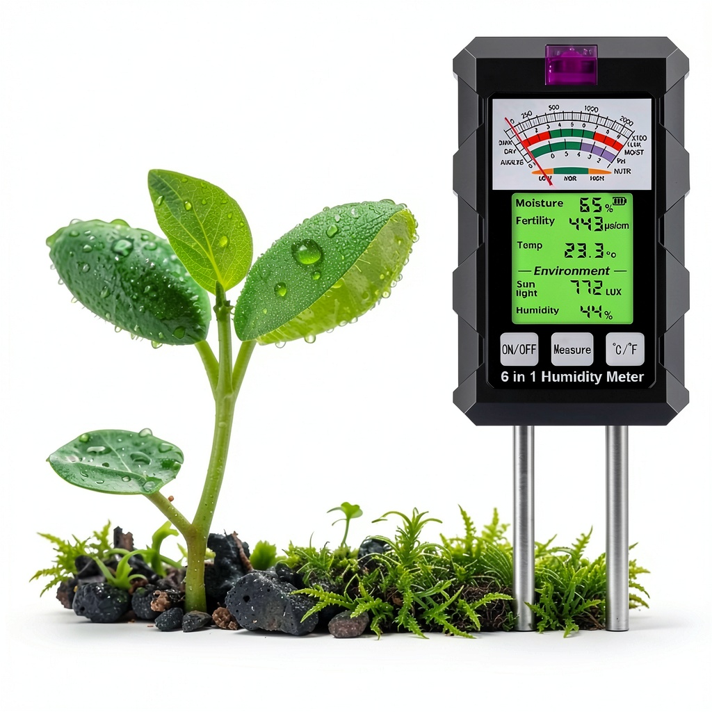 • 6-in-1 functionality for measuring moisture, pH, temperature, sunlight, fertility, and humidity