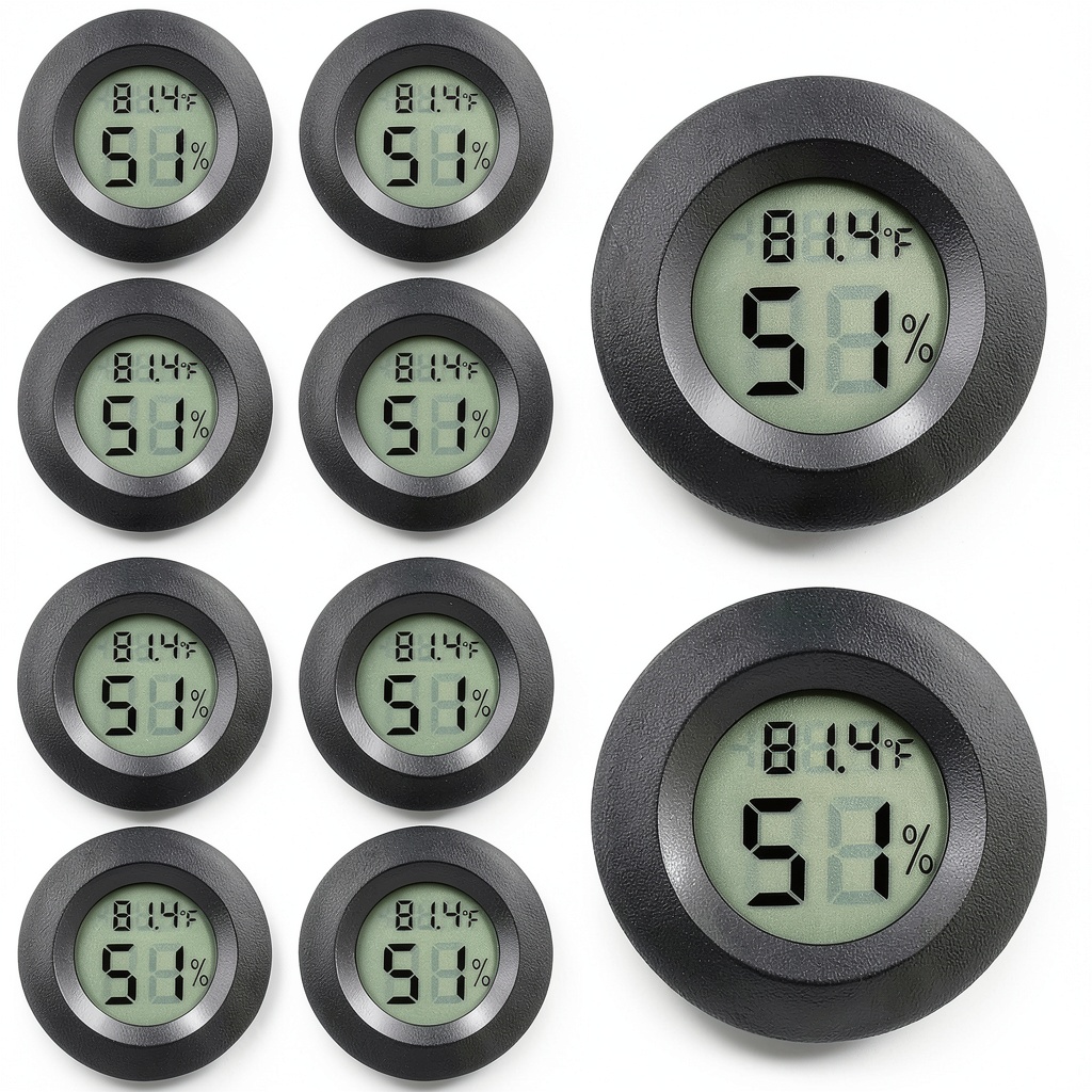 The LemonBest 10-Pack Mini Hygrometer Thermometer is designed for precise climate monitoring in multiple environments. Each unit measures 4.5 x 4.5 x 1.5 cm and weighs just 25 grams, featuring a durable ABS casing that resists moisture, dust, and impacts. With a temperature range of -50°C to 70°C and humidity tracking at ±1% resolution, these devices update every 10 seconds on a high-contrast LCD screen. Specifications include product dimensions of 1.77 x 1.77 x 0.59 inches, a weight of 7.05 ounces for the set, and a manufacturer date of March 4, 2025, ensuring reliable performance for various applications.